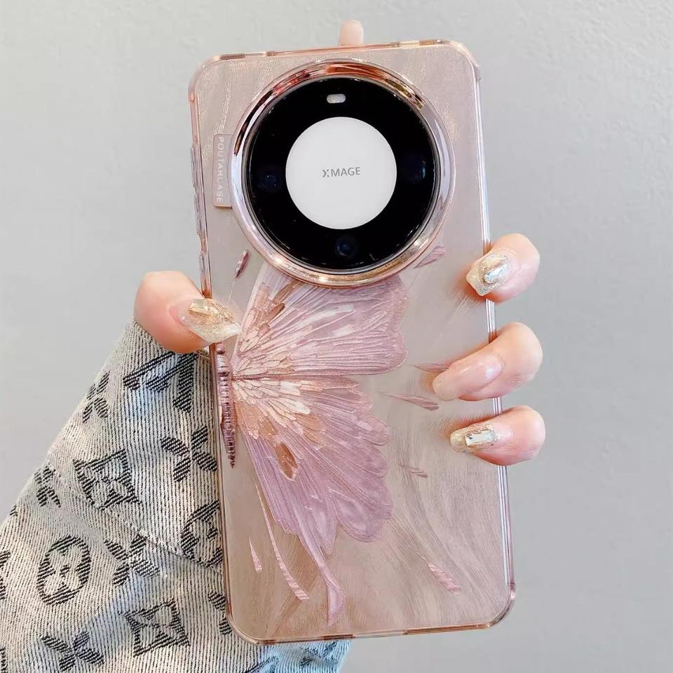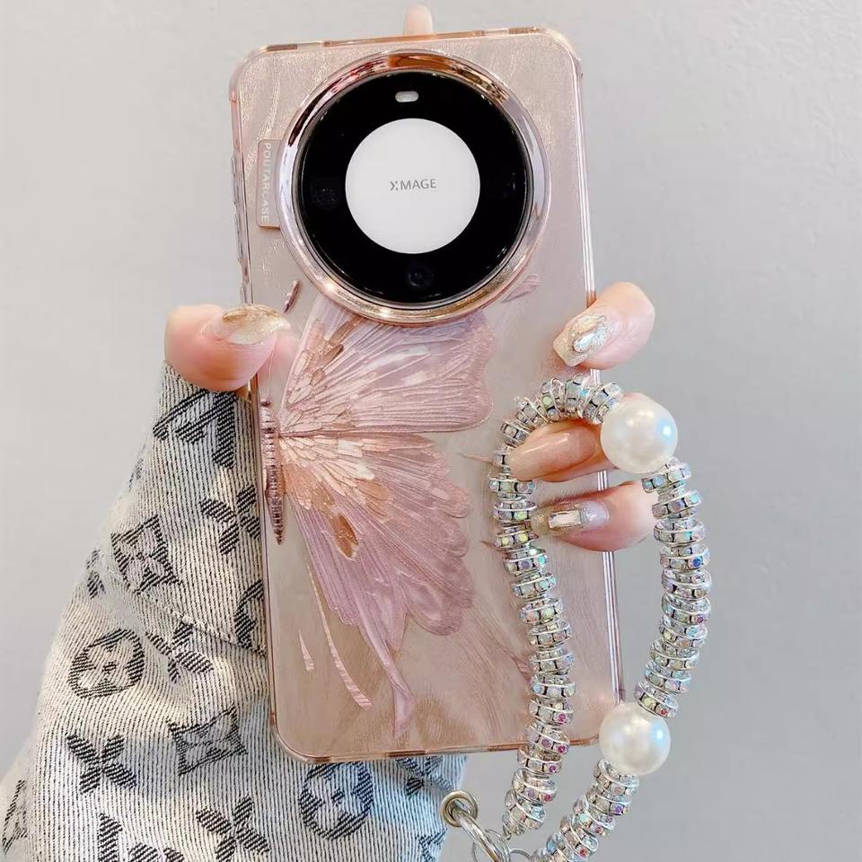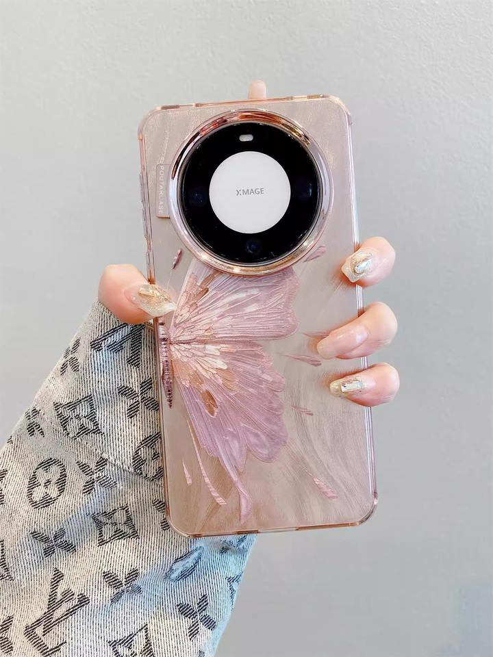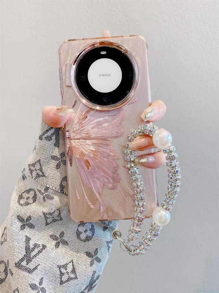 Pink Half Butterfly Feather Gauze Mobile Phone Case for Huawei Mate 60 Pro Mate 40 P70 P50 Cover with Lanyard Included
