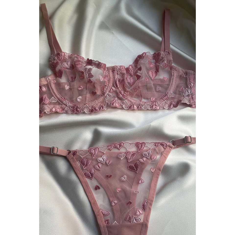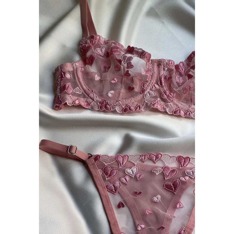 Ensemble de lingerie rose avec détails en forme de cœur, soutien-gorge et string de haute qualité, style romantique confortable, décoration avec nœud, design à bonnets rembourrés