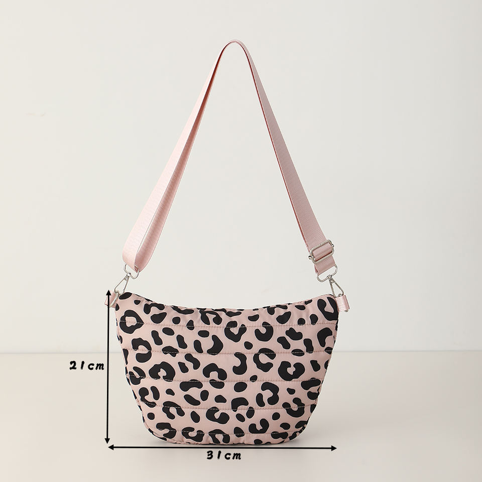 Sac banane matelassé léopard rose en nylon léger avec sangle réglable et poche avant zippée, sac à bandoulière décontracté pour le quotidien