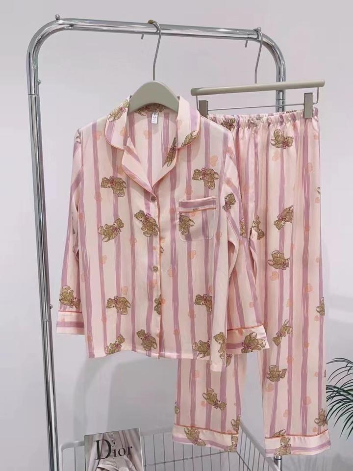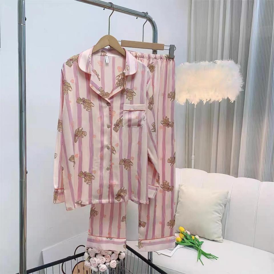 Rose petit ours pyjama ensemble glace soie soie visage femmes été brodé haut pantalon maison vêtements