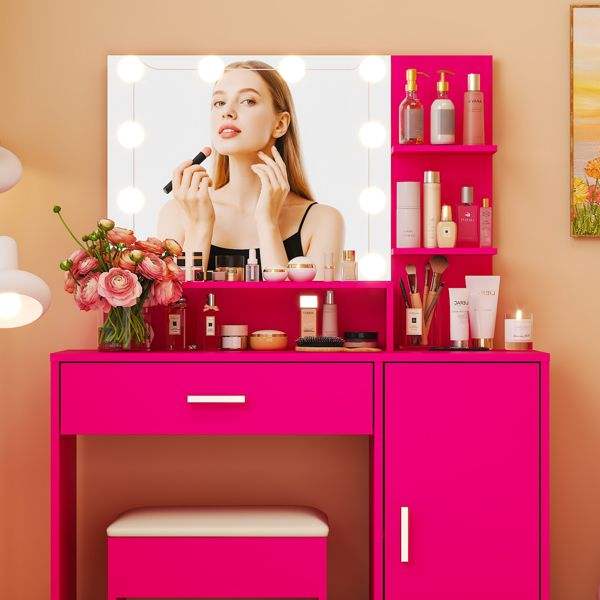 Ensemble de coiffeuse en MDF rose avec placage mélaminé, 1 tiroir, 1 porte, ampoule à trois couleurs