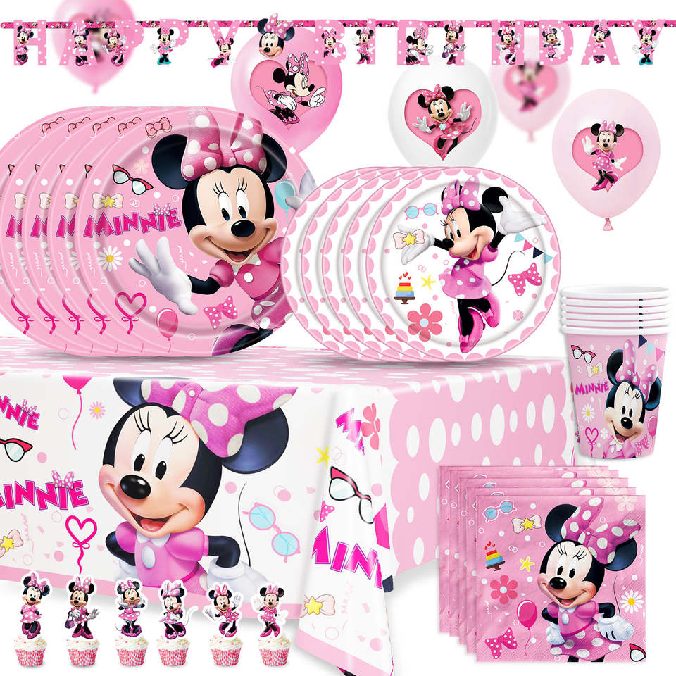 Pink Minnie Mouse Birthday Party Decorations Supplies Serves 16 Guests with Banner Table Cover Disposable Dinner Plates K0201