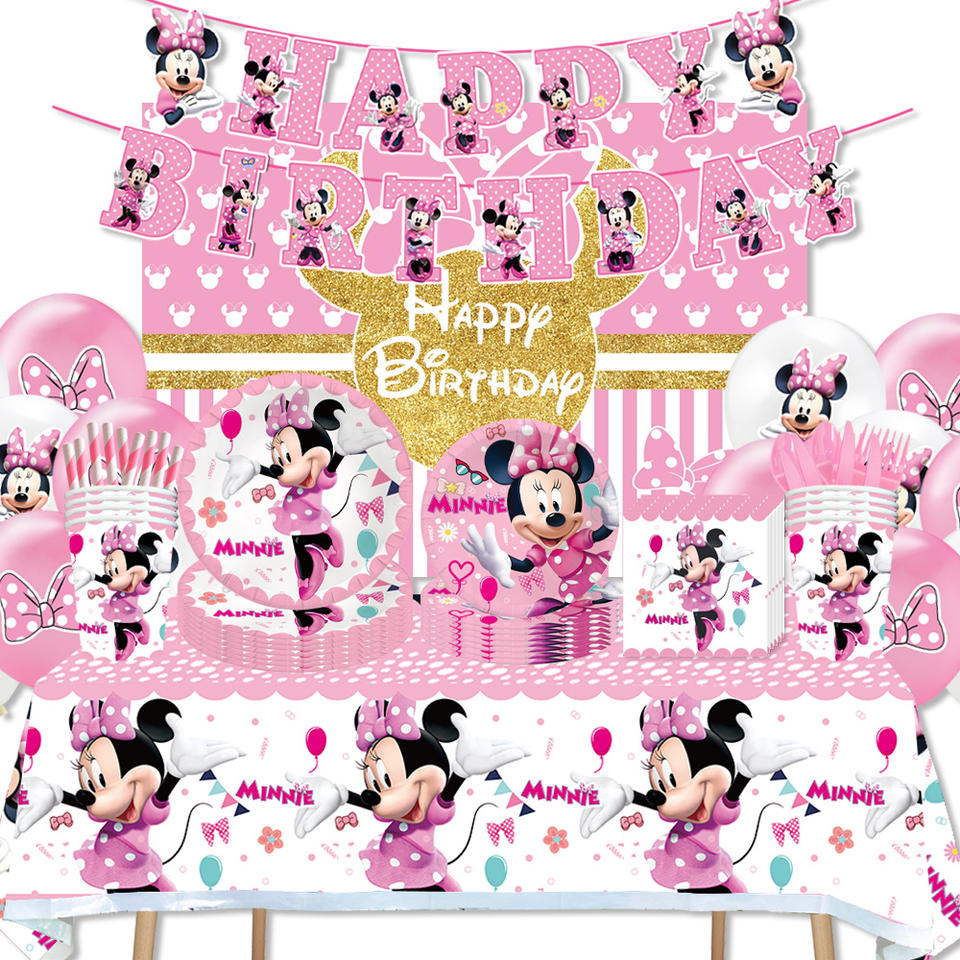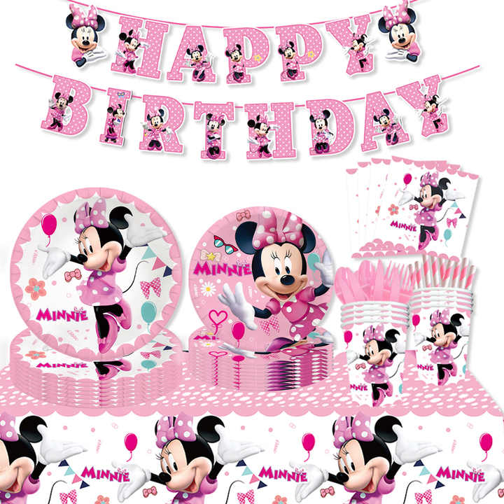 Ensemble de vaisselle jetable pour fête d'enfants Minnie Mouse rose, assiettes en papier, gobelets, bannière Joyeux Anniversaire, vente en gros