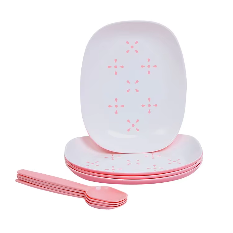 Assiette à collation rose polyvalente avec cuillère de service compacte allant au micro-ondes et au lave-vaisselle Mélamine et matière plastique sans BPA