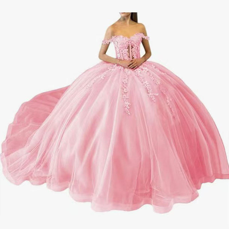 Pink Off Shoulder Ball Gown Princess Waistline Sweetheart Neckline Tulle Evening Dress For Wedding Party