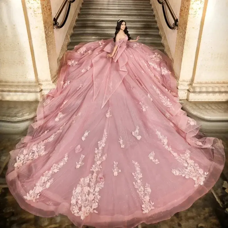 Rose hors épaule grand Train bal à plusieurs niveaux vestidos De 15 formelle princesse fête robes de bal douce 16 robes De Quinceanera