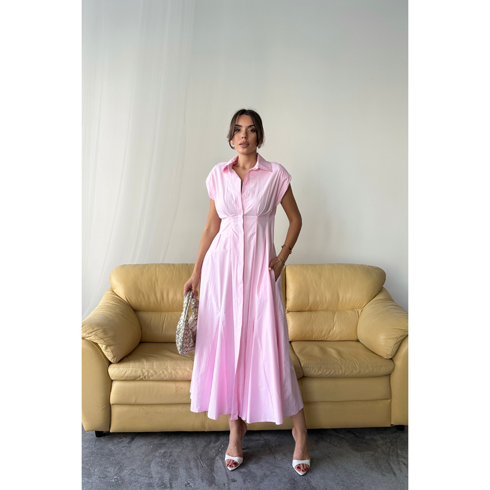 Robe en popeline rose sans manches, rembourrée, boutonnée sur le devant avec détail de plis à la taille, style bureau translucide, ODM XS-XL, longueur ras du sol