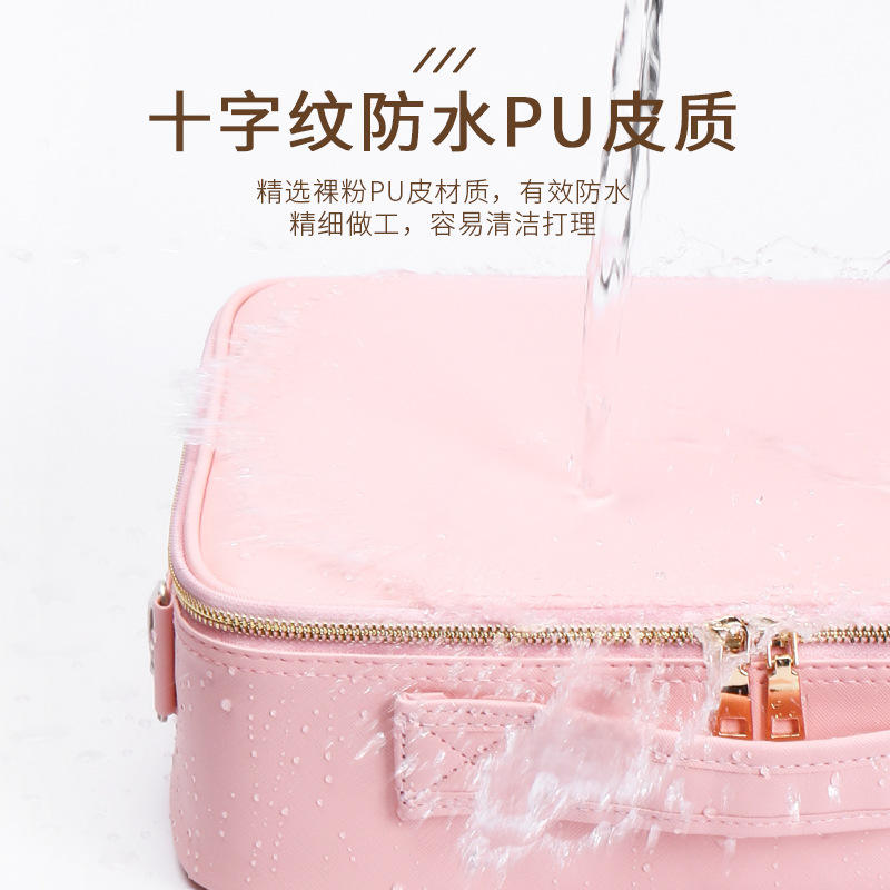 Trousse de maquillage rose en cuir PU, grande capacité, avec fermeture éclair et boucle, pour rangement à domicile, couleur unie, poignée souple