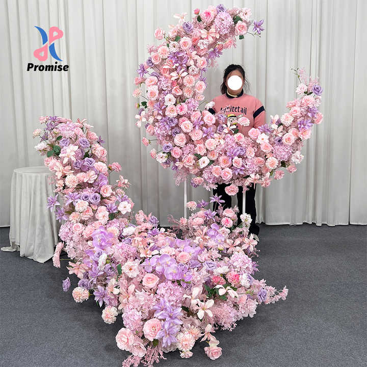 Arche florale romantique en soie artificielle réaliste en forme de lune, dégradé rose-violet, faite à la main, écologique, réutilisable et recyclable