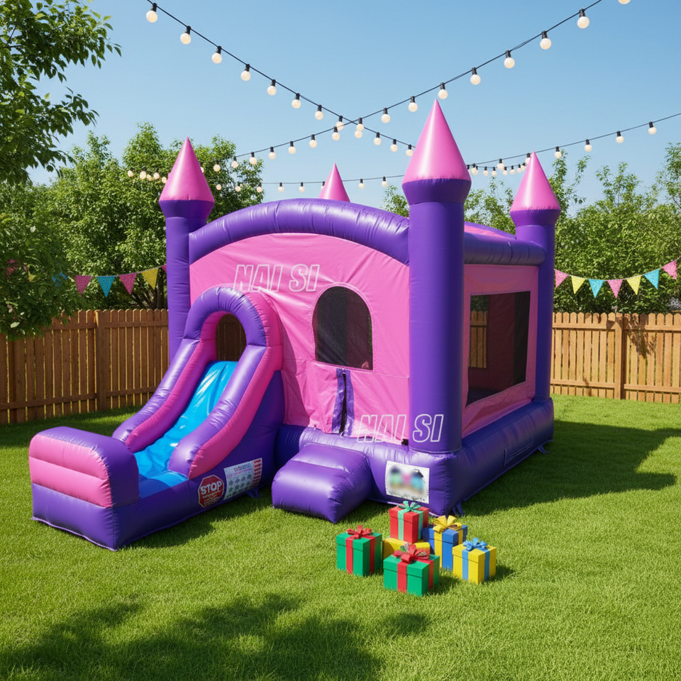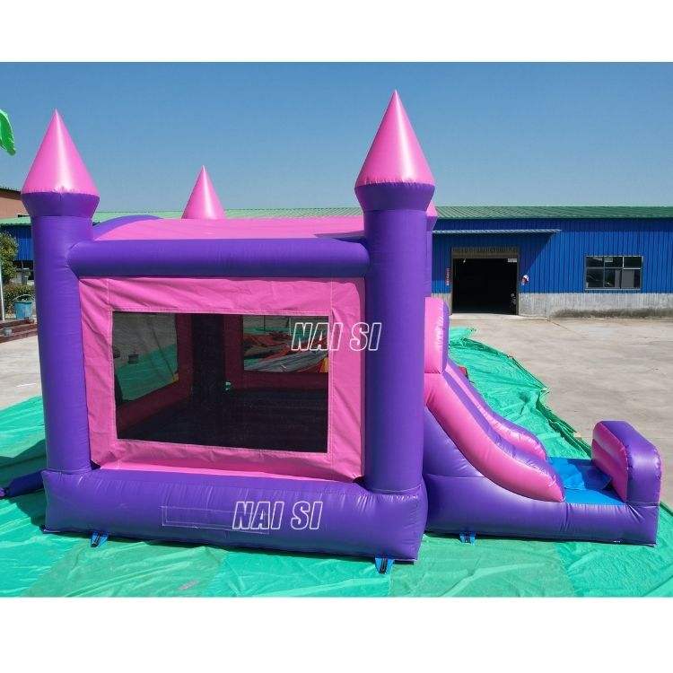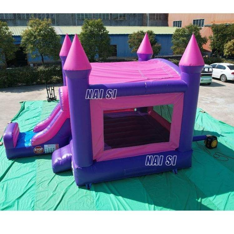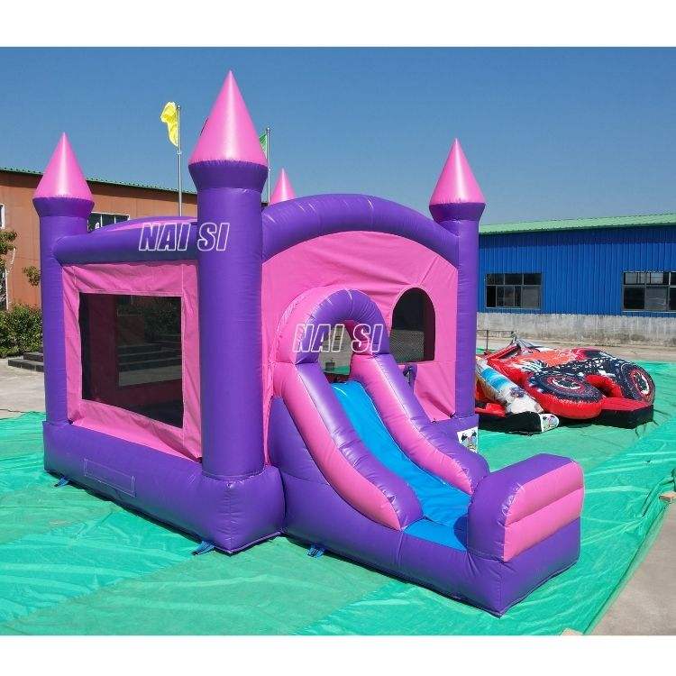 Château gonflable rose et violet avec toboggan, structure de saut combinée pour enfants, idéal pour la location de fêtes