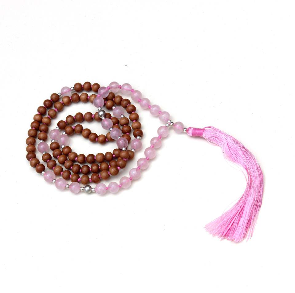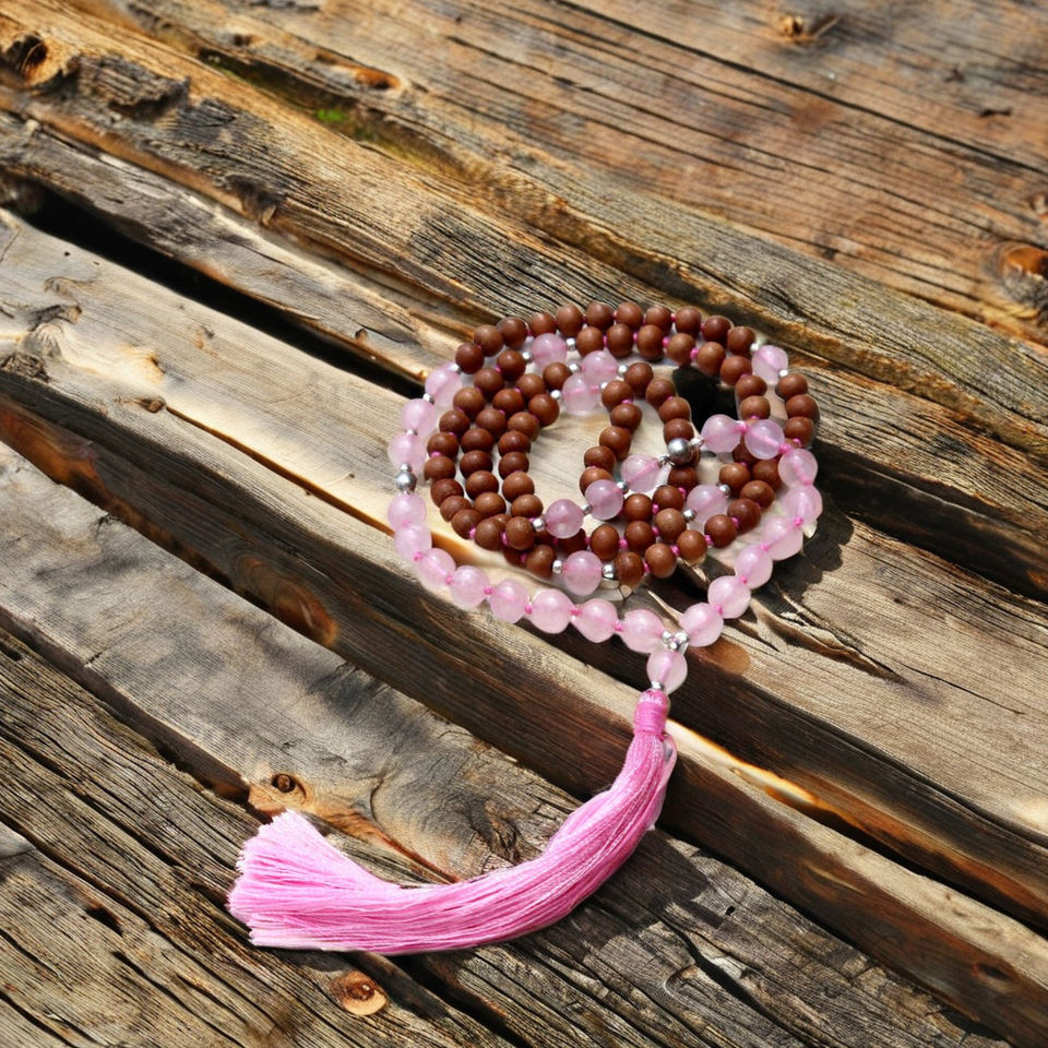 Collier Mala en cristal de Quartz rose, perles en bois, cœur Chakra 108 perles, colliers de perles d'artiste indien faits à la main