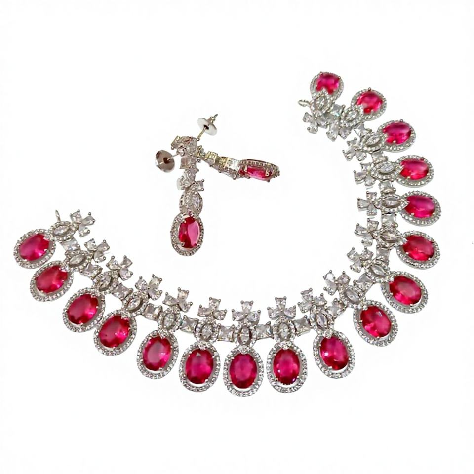 Parure de bijoux de mariée classique en strass rose, collier et boucles d'oreilles chandelier, plaqué argent, pour mariées et occasions spéciales