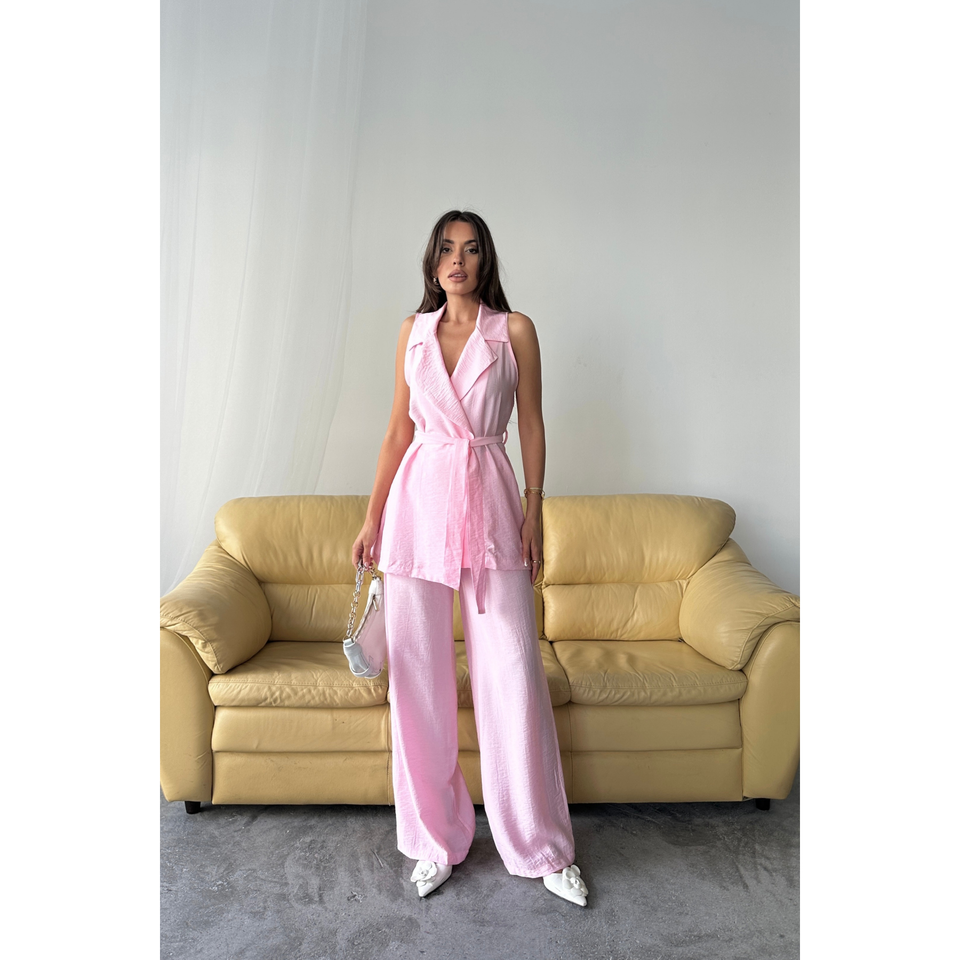 Ensemble gilet rose sans manches et pantalon large pour femme, taille S, tissu aspect lin, tenue décontractée