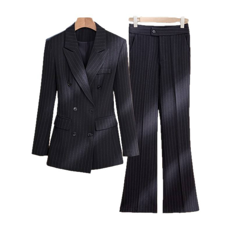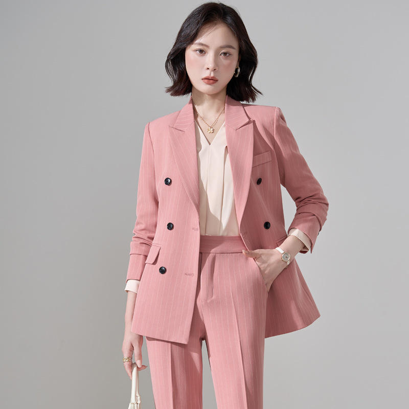 Pink Striped Suit Set Women Double Breasted Blazer Pants Formal Work Wear Autumn British Style Anti-Wrinkle Polyester Fabric