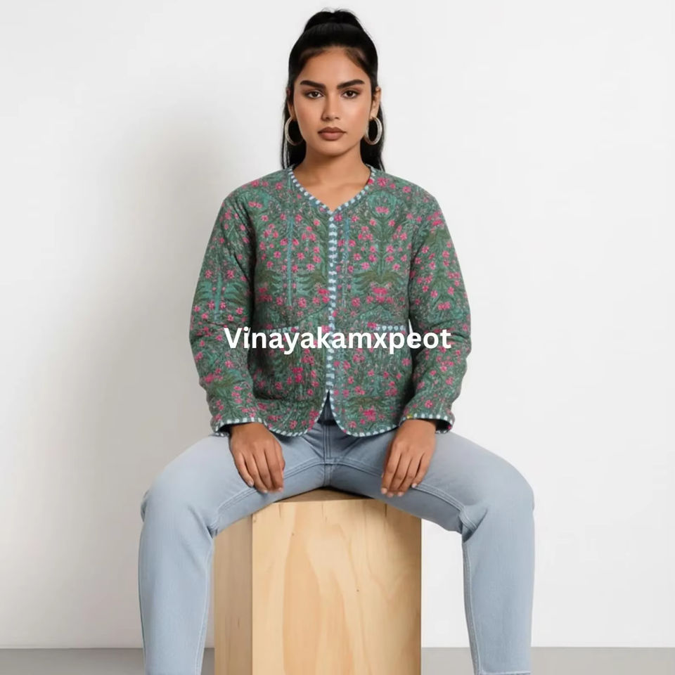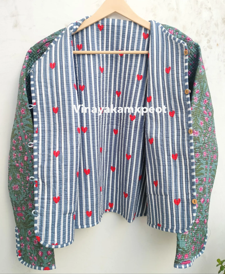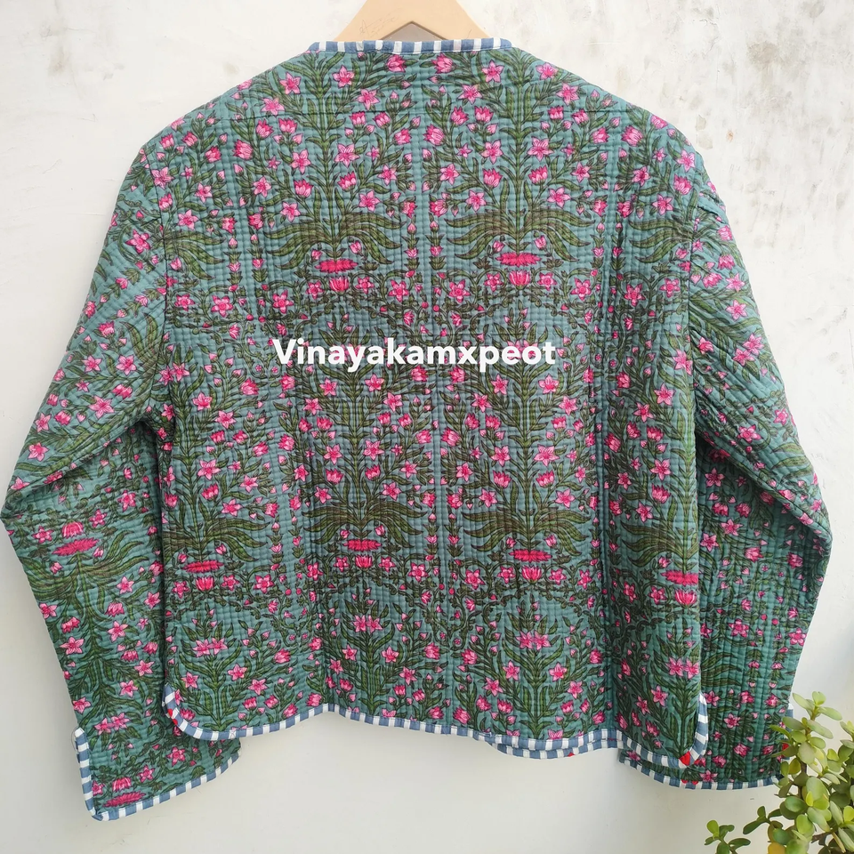 Veste matelassée réversible rose tropicale Kantha, confectionnée en tissu 100% coton doux, respirant et écologique, broderie hivernale