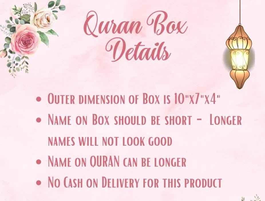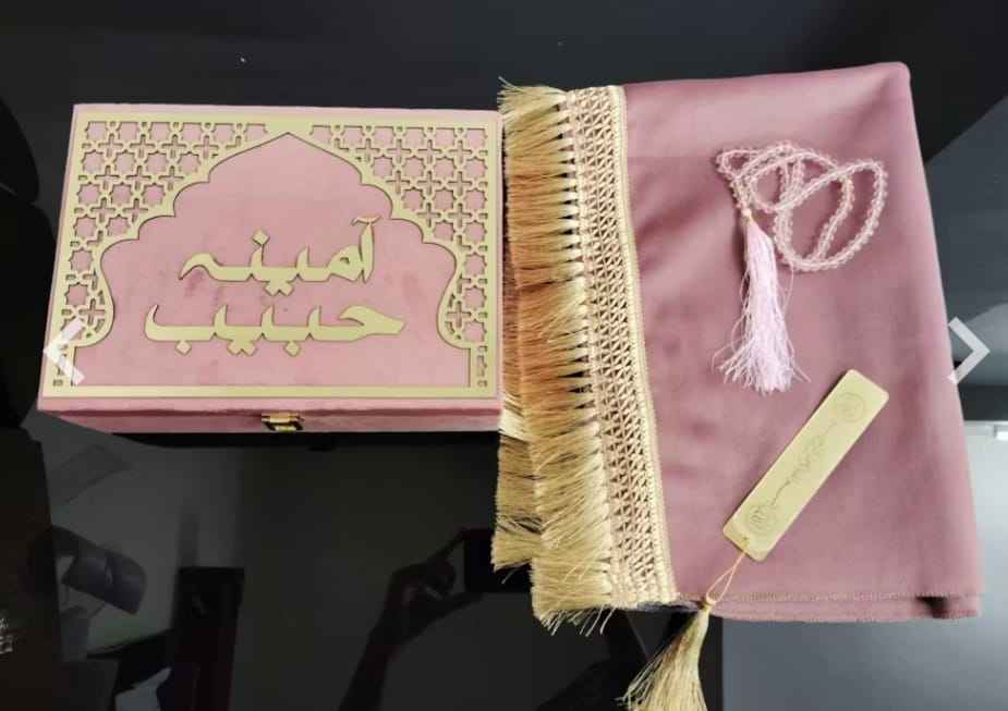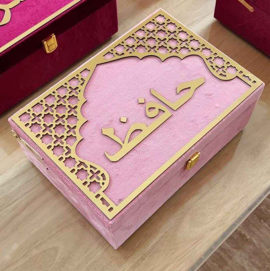 Boîte à Coran en velours rose avec design islamique doré, nom personnalisé, boîte de rangement rectangulaire de luxe pour la prière