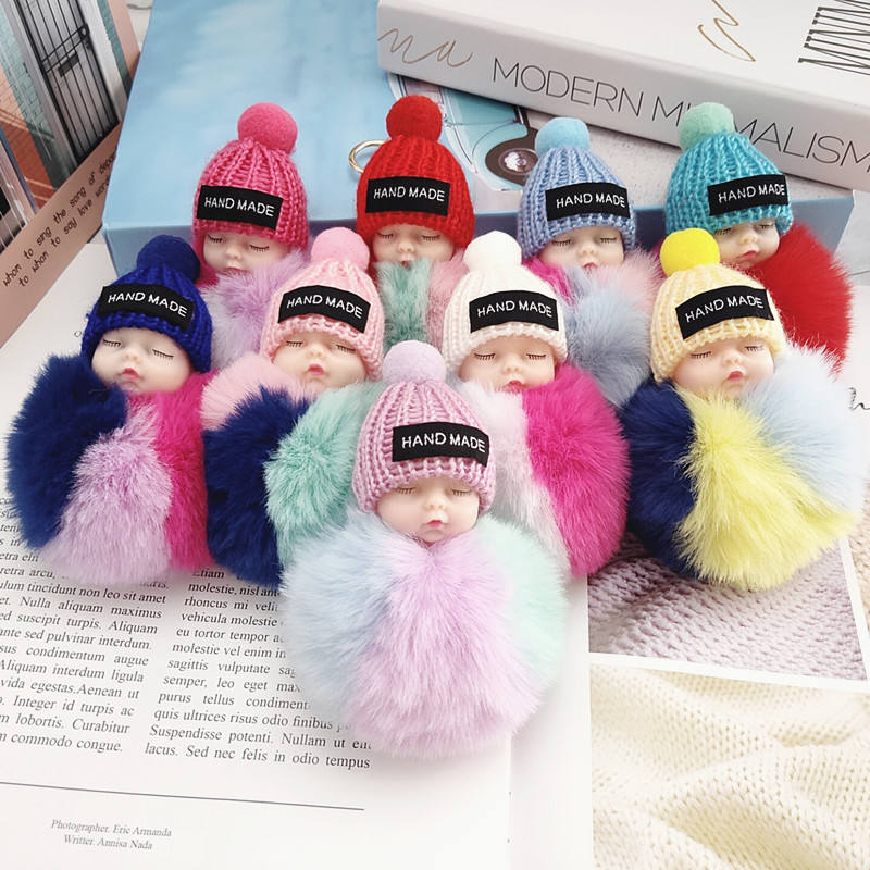 Nom:Mignon bébé endormi porte-clés lapin fourrure porte-clés pour les filles avec pompon