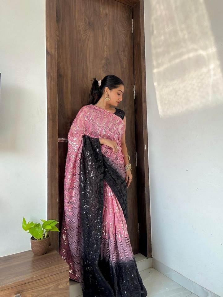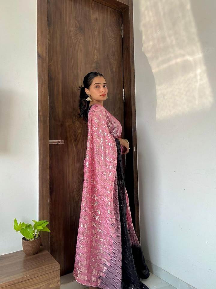 Saree Georgette de couleur rose avec travail de broderie de séquence Designer Wedding Function Wear Saree, Party Wear Saree, Designer Outfit