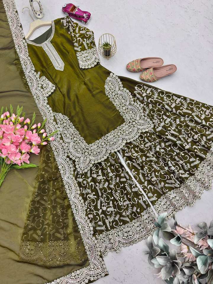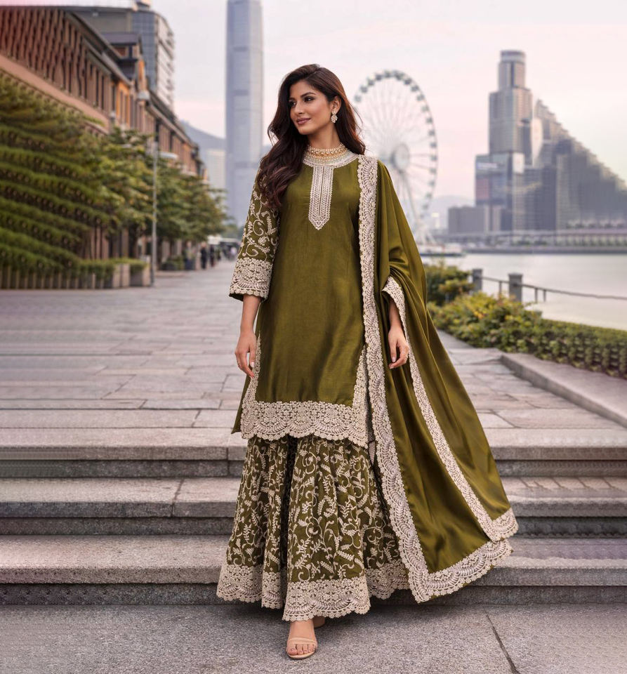 PinkCityBlocks Ensemble Sharara en Soie Style Indien Pakistanais avec Broderie de Fil et Paillettes, Dupatta à Bordure en Dentelle, Coupe Ample pour Femme, Idéal pour les Fêtes, Livraison Rapide