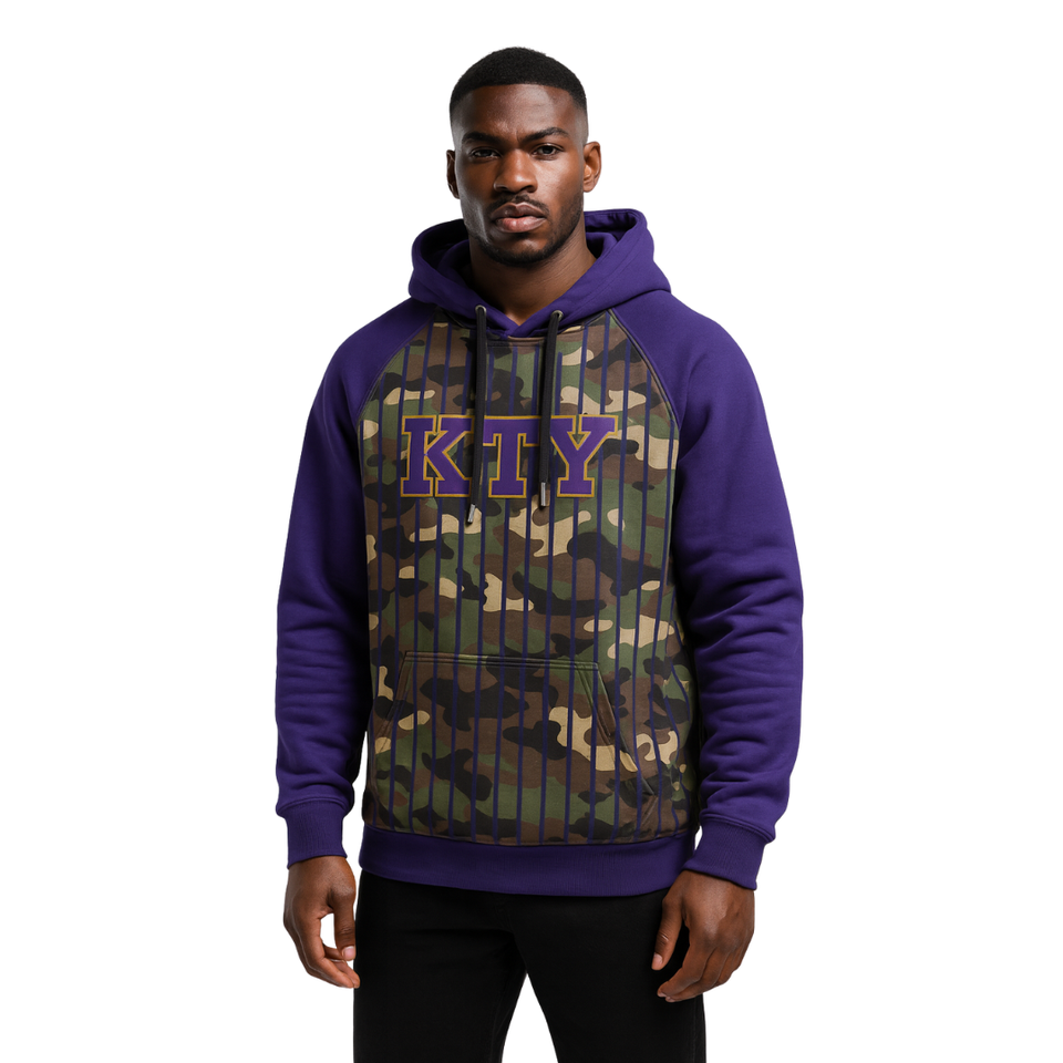 Sweat à capuche Camo de qualité supérieure à rayures Omega Fraternité et manches raglan violettes avec logo en chenille Divine Nine HBCU Apparel