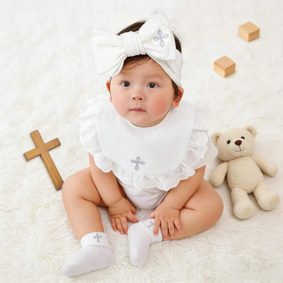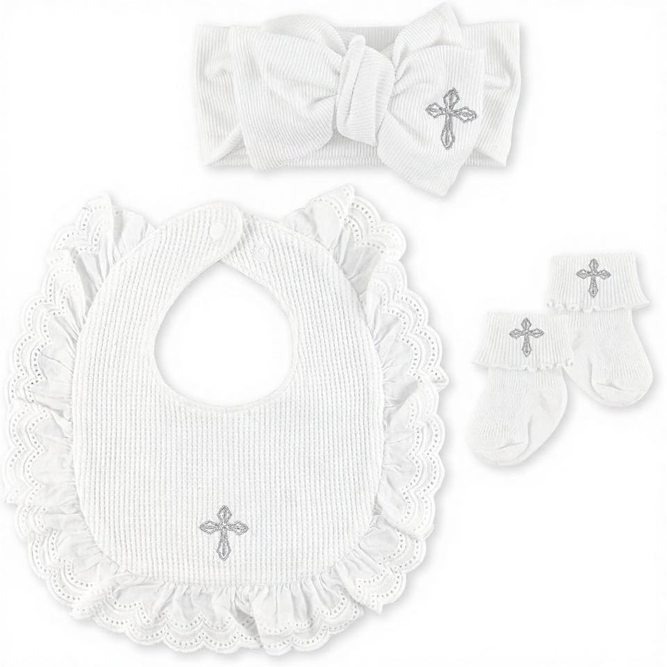 Ensemble cadeau de baptême Pinuotu pour bébé, bavoir, bandeau et chaussettes 100% coton avec croix brodée pour nouveau-nés garçons et filles