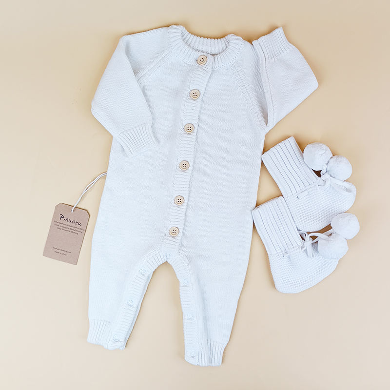Pinuotu bébé vêtements ensembles bébé barboteuses 100% coton uni blanc costume tricot nouveau-né tenue mignon pompon boule chaussons ensemble