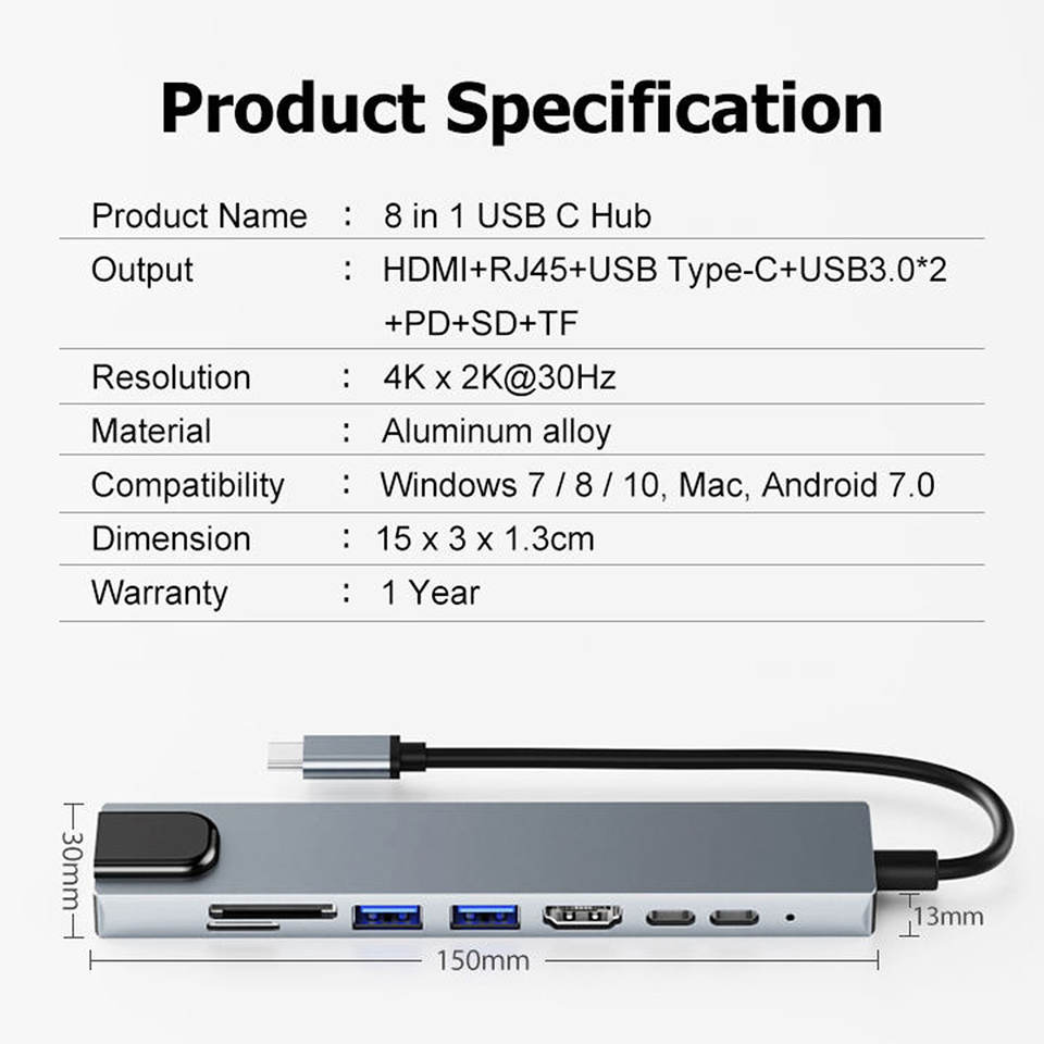 Pix-Link 8in1 USB HUB Type C Splitter 4K Thunderbolt 3 Station d'accueil Adaptateur pour ordinateur portable pour Macbook Air M1 RJ45 HDTV Stock