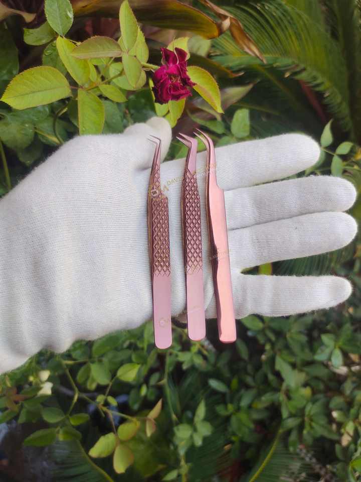 Pince à épiler d'extension de cils professionnelle faite à la main à 90 degrés Logo personnalisé Plasma or rose acier inoxydable poignée en diamant pointue