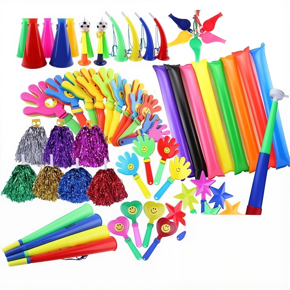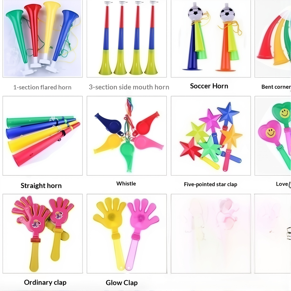 Accessoires de cheerleading en plastique : Corne de compétition, Bâton gonflable, Sifflet d'activités, Claquette, Autocollant, Boule de cheerleader imprimée