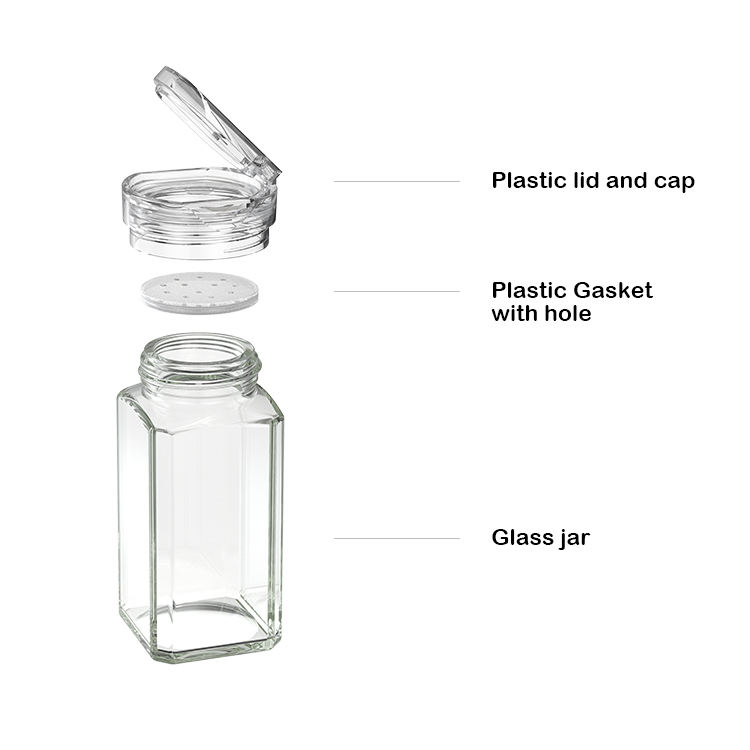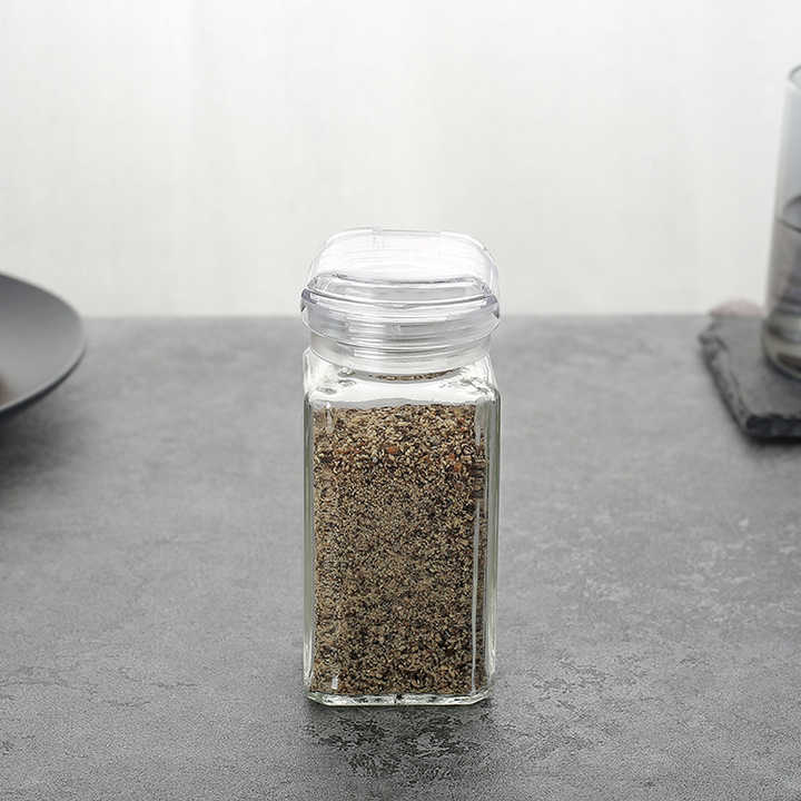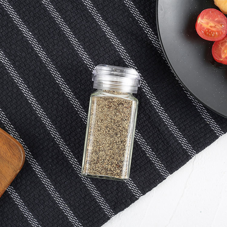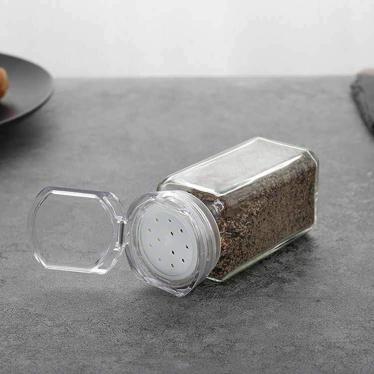 Couvercle à secouer en plastique LFGB certifié logo personnalisé 4oz vide poche carrée salière et poivrière avec bouteille en verre salière