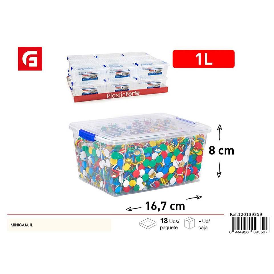 Boîte de rangement rectangulaire transparente PlasticForte MiniBox 1L avec couvercle bleu pour organiser les petits objets, usage domestique et bureau