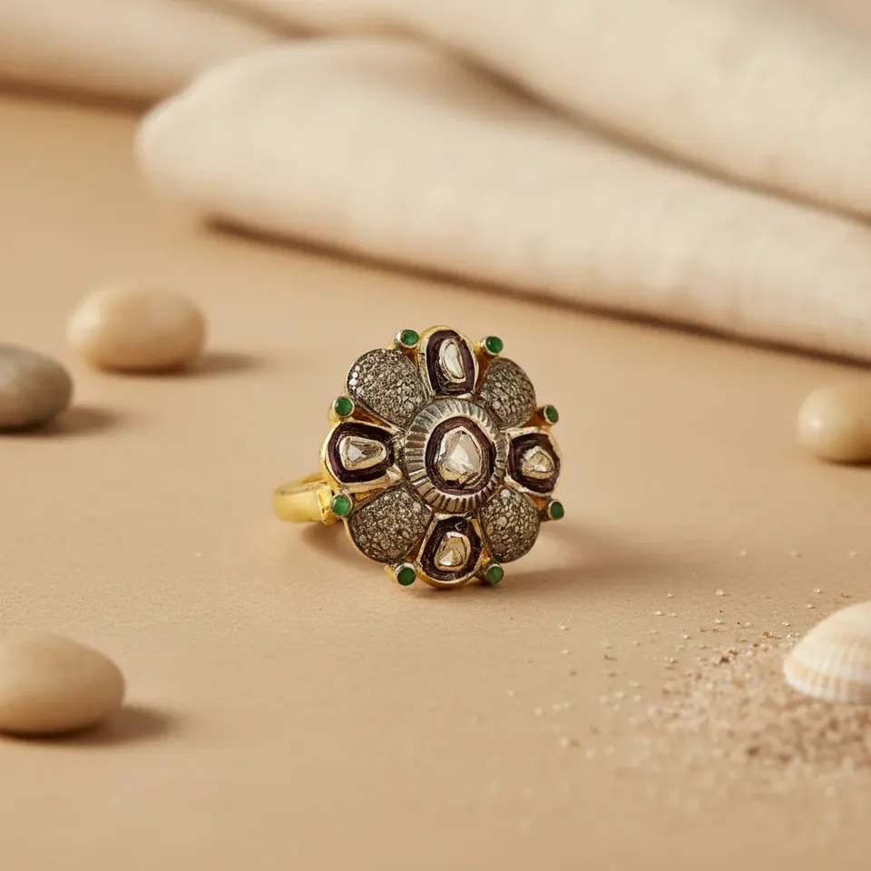 "Platinum & Yellow Gold Marquise Ring with Diamonds & Emeralds for Women Rhodium Plated Promise Occasion"