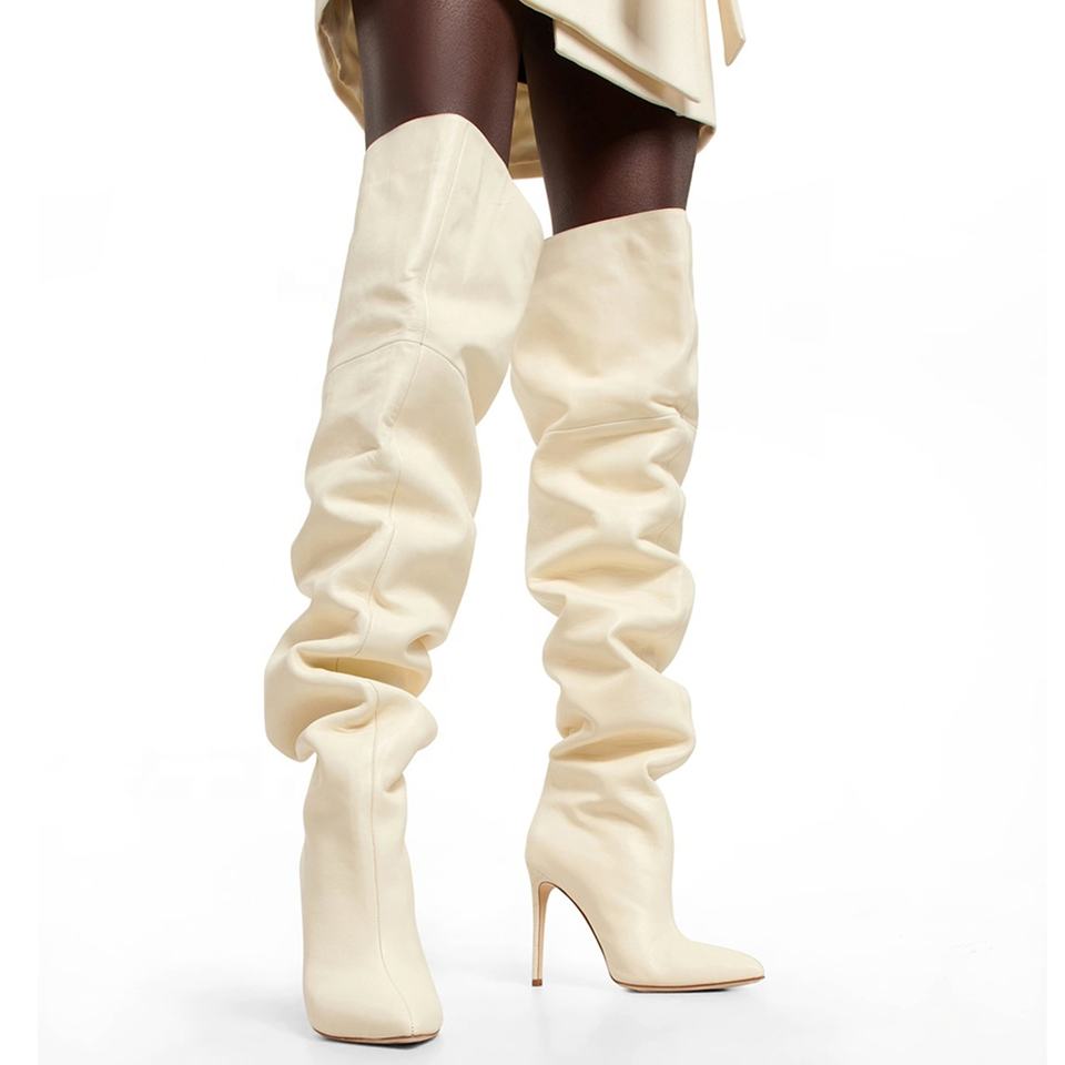 Bottes à talons fins en cuir PU Beige, bottes longues à bout pointu pour femmes, chaussures d'hiver, grande taille, 2022