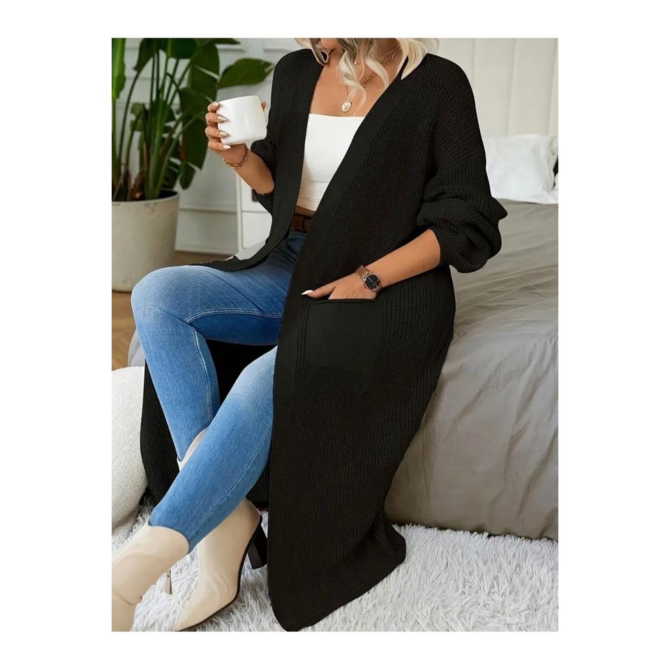 Cardigan long en tricot drapé noir grande taille avec poches, cardigan ajusté pour femmes 2XL-3XL