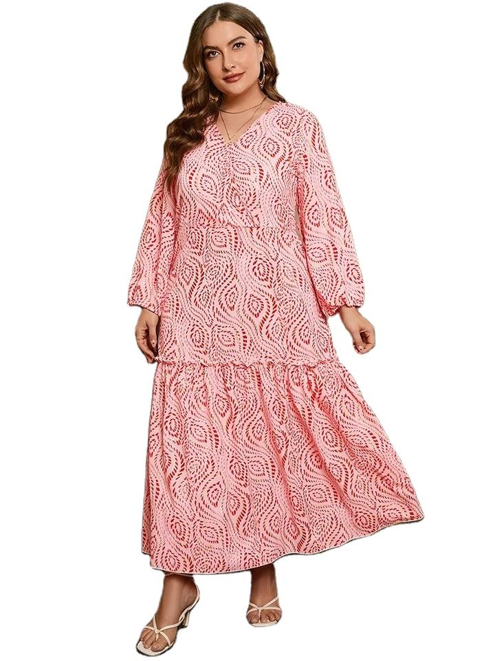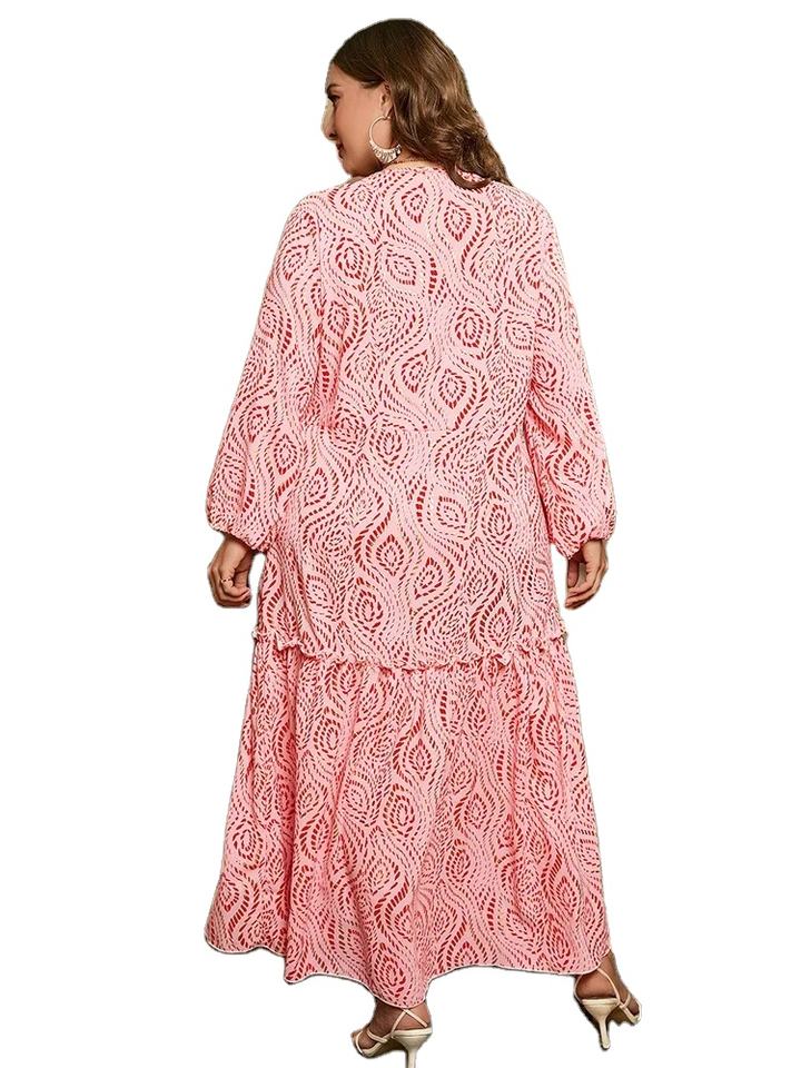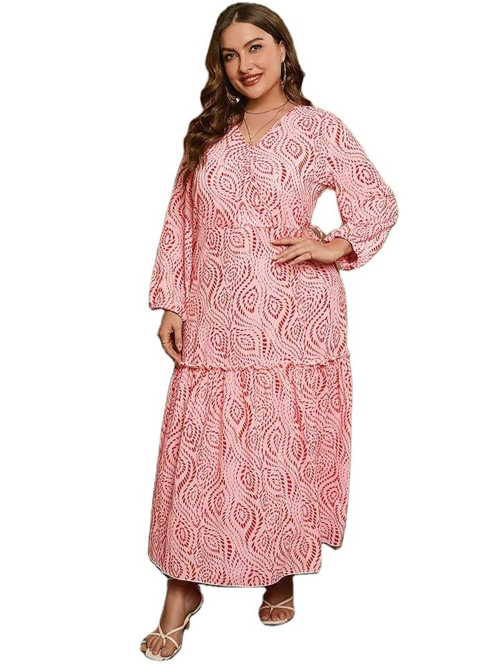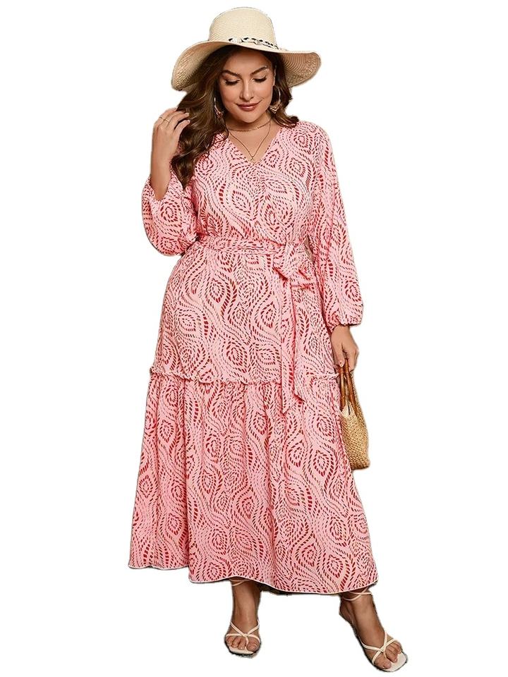 Robe avec ceinture à manches longues et col V doré imprimé de grande taille Robe maxi trapèze bohème décontractée pour femmes printemps automne