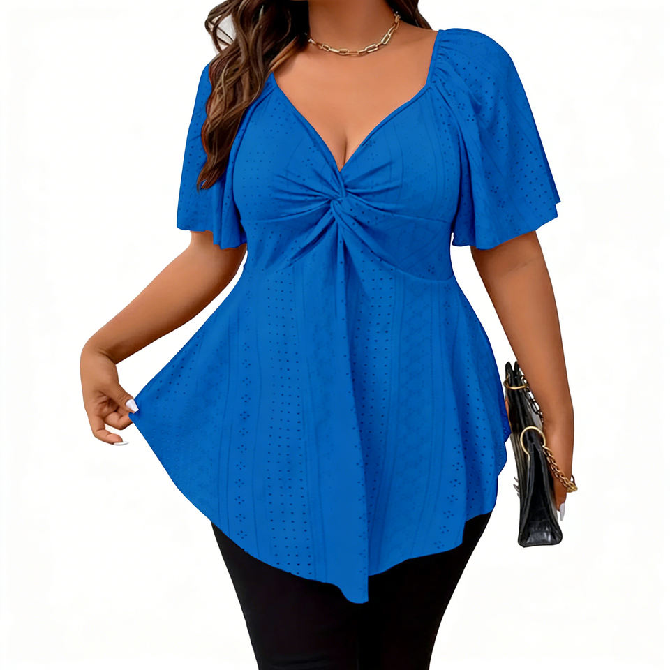 Plus Size V Neck Twist Front Eyelet Embroidery Blouse Women Casual Short Sleeve Asymmetrical Hem Tops