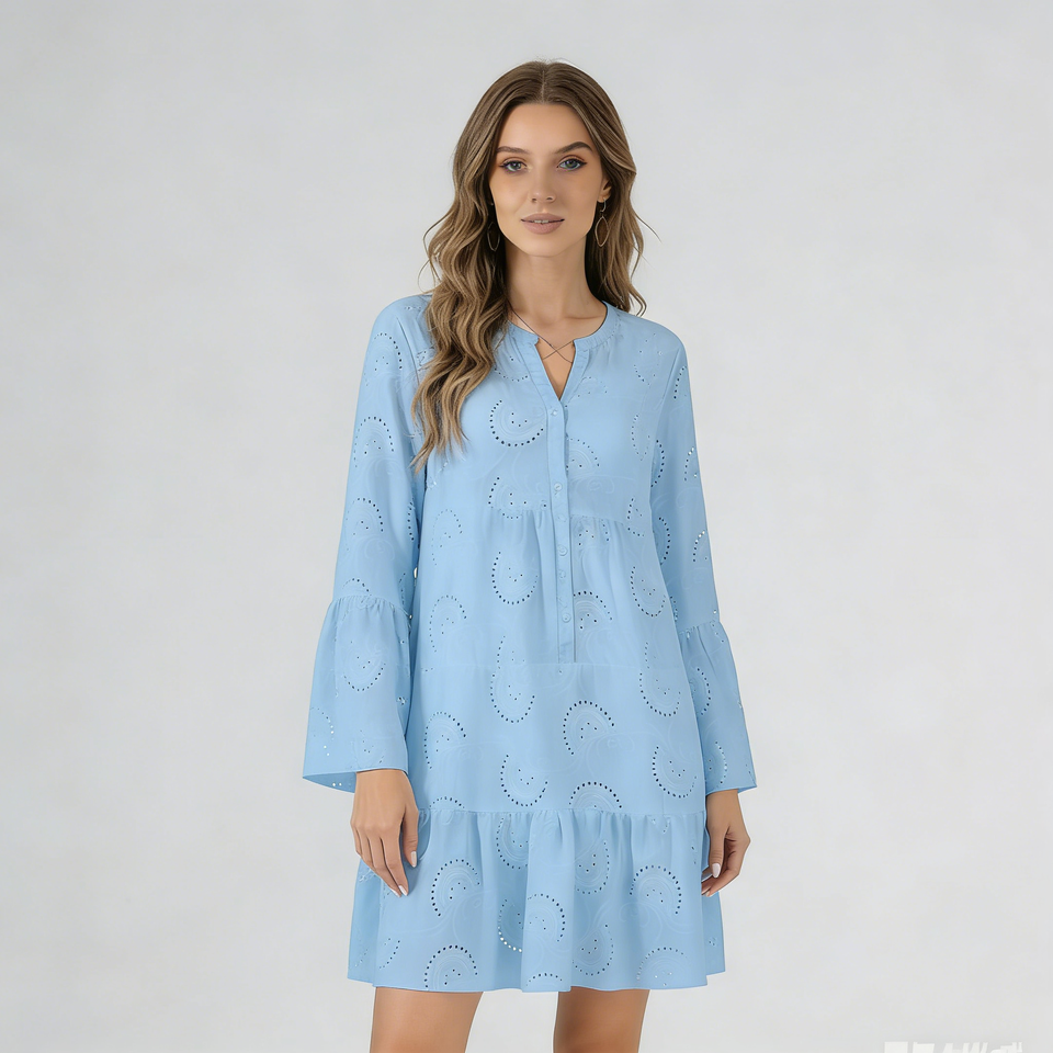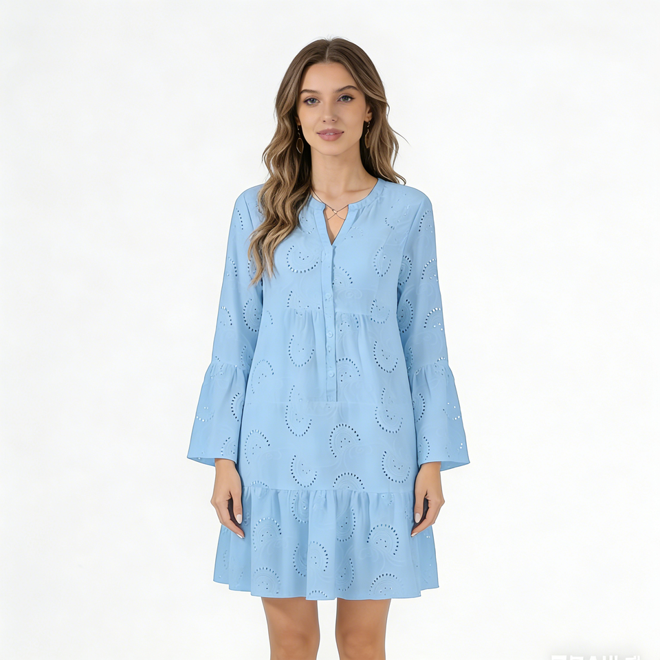 Plus Size Women's Light Blue V-neck Knit Embroidery 3D Shift Dress Bell Sleeve Ruffled Hem Loose Fit Casual Knee-Length