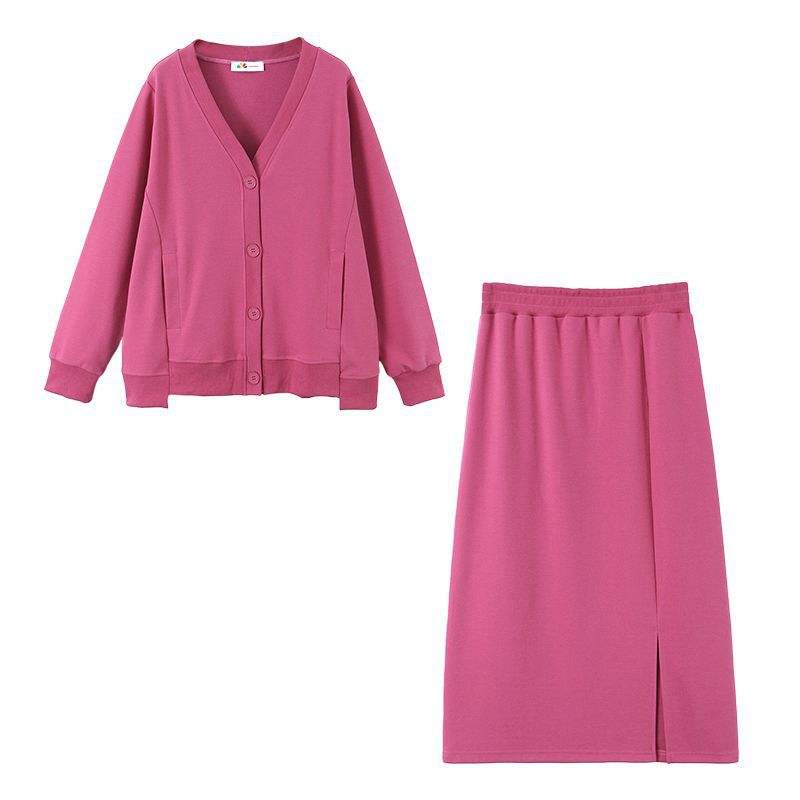 Pink top, pink skirt; black top, black skirt; gray top, gray skirt.color