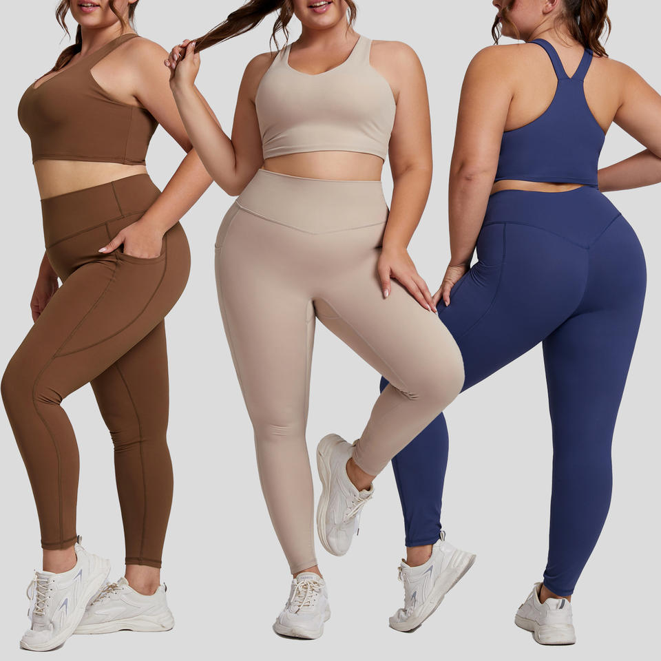 Plus Size Yoga Outfit Set Women High Waisted Leggings Pockets Scoop Neck Crop Top Solid Color Fitness Workout Running Dance Wear