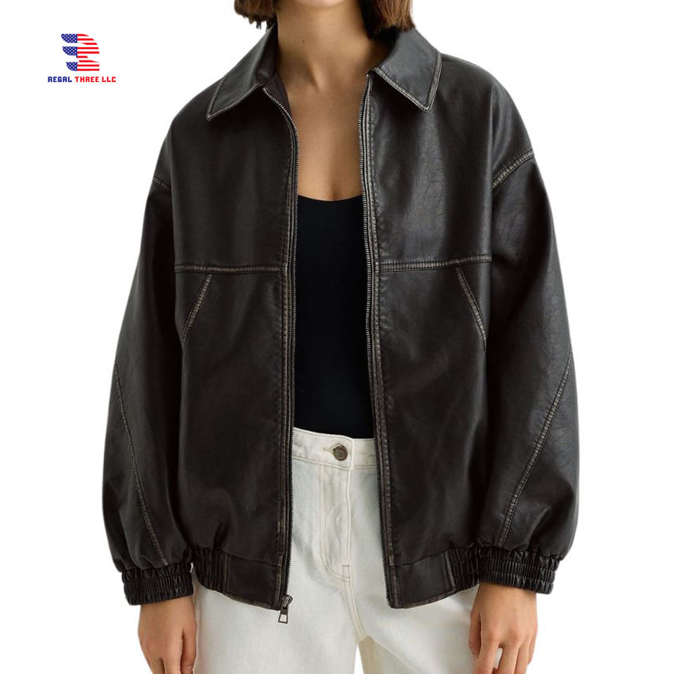Veste en cuir grande taille pour femmes Manteau en cuir à col rabattu à la mode avec fermeture éclair Veste Letterman surdimensionnée en cuir pour femmes