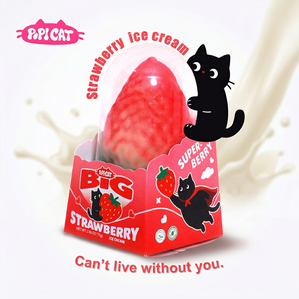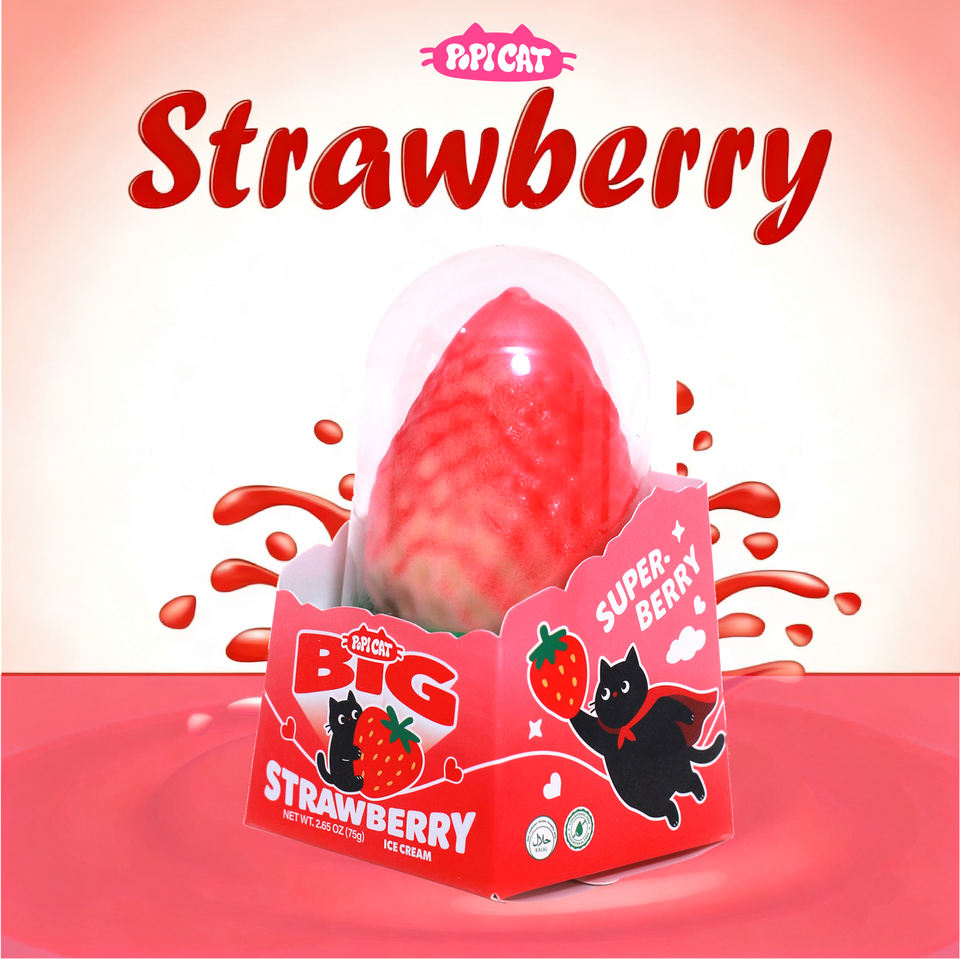 PoPI CAT Promotion : Crème glacée à la fraise, motif chat noir mignon, forme de fruit réaliste, édition limitée été, dessert en cône sucré