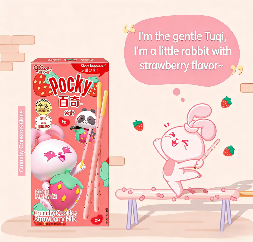 Bâtonnets de biscuits Pocky Rabbit saveur fraise avec grains de fraises véritables et blé entier, emballage lapin mignon