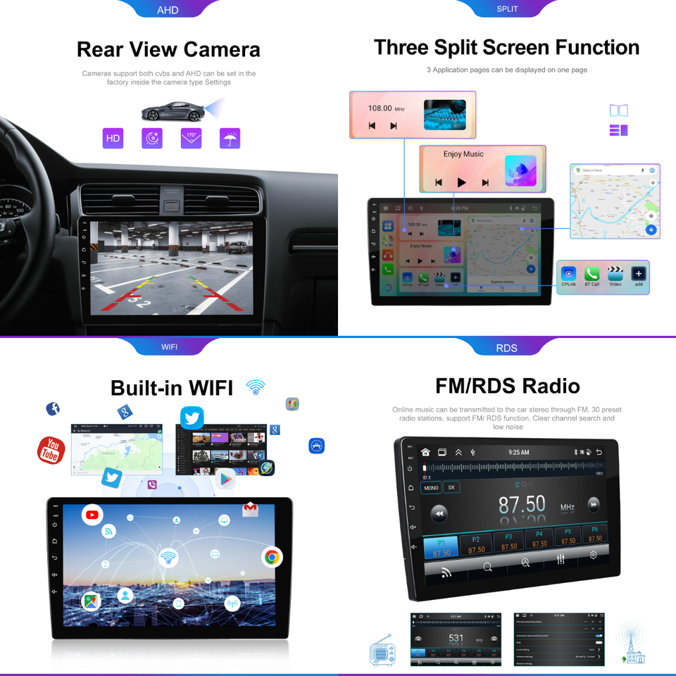 GPS, Stéréo, OBD2, DSP, CarPlay, Android auto, Image dans l'image, Microphone intégré, Écran partagé, Gestionnaire de fichiers, Volant de voiture de Contrôle, Haut-parleur intégré