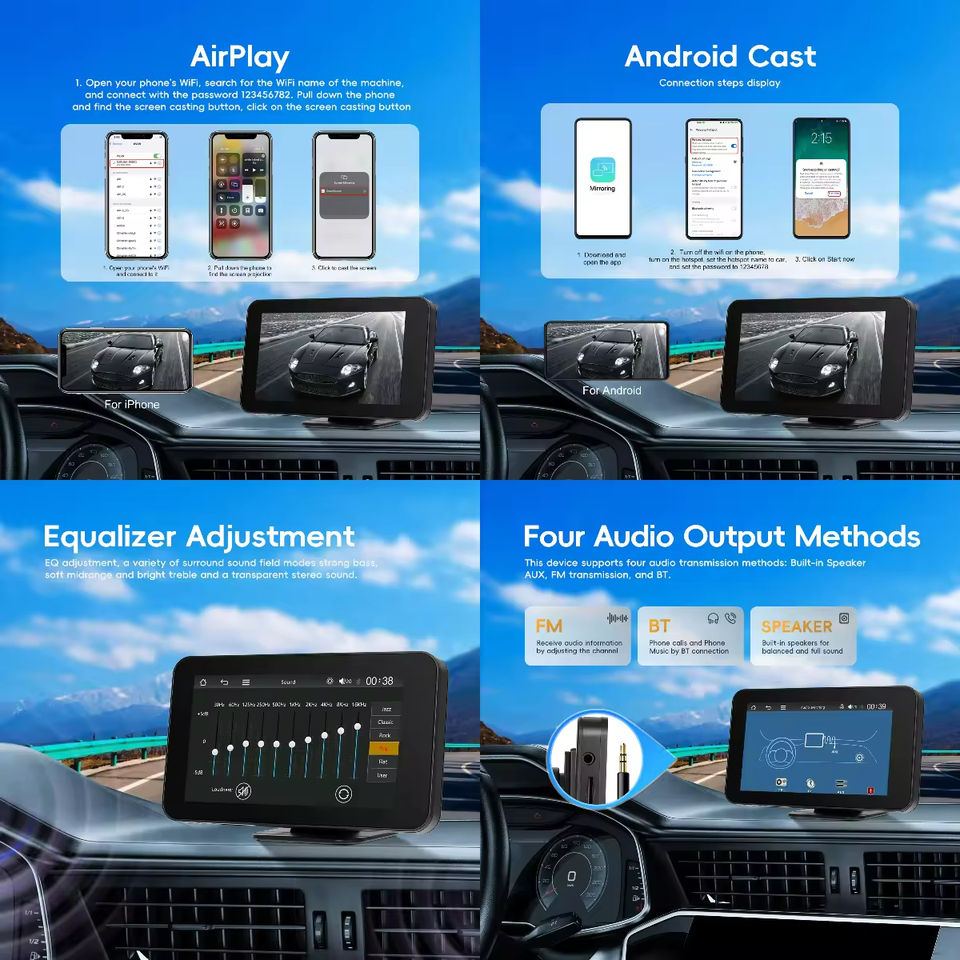 Podofo 4.7'' Navigation portable sans fil CarPlay/Android Auto, écran tactile IPS, GPS/BT/FM/AUX/EQ/Sortie audio/Installation facile