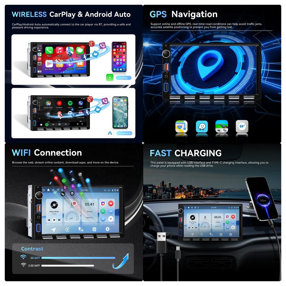 Autoradio Podofo 7'' 4+64G Double Din avec Carplay/Android Auto sans fil, Wifi, GPS, USB, Bluetooth, clavier piano, charge rapide, stéréo de voiture