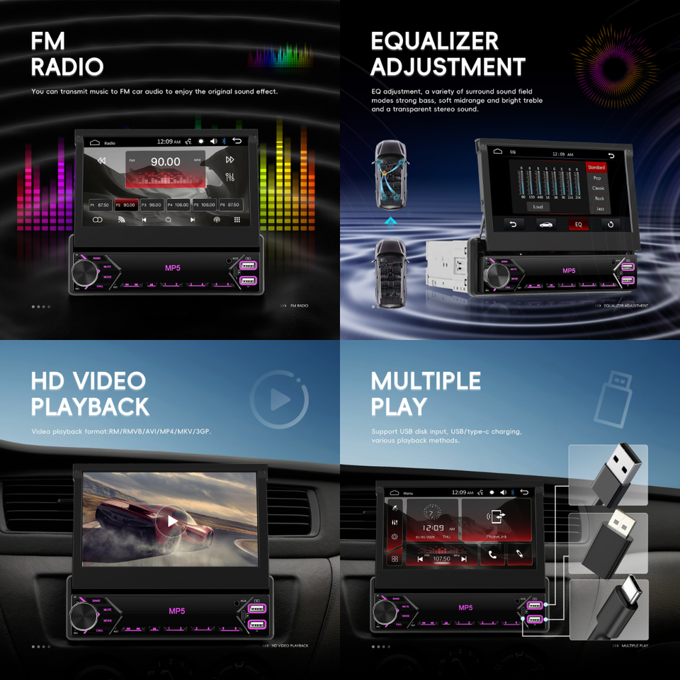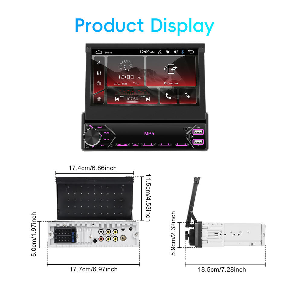 Podofo Autoradio MP5 Voiture 1 DIN 7 Pouces Écran Tactile Rétractable IPS USB/Type-C/BT/EQ FM Caméra Arrière Ajustement Universel OEM ODM