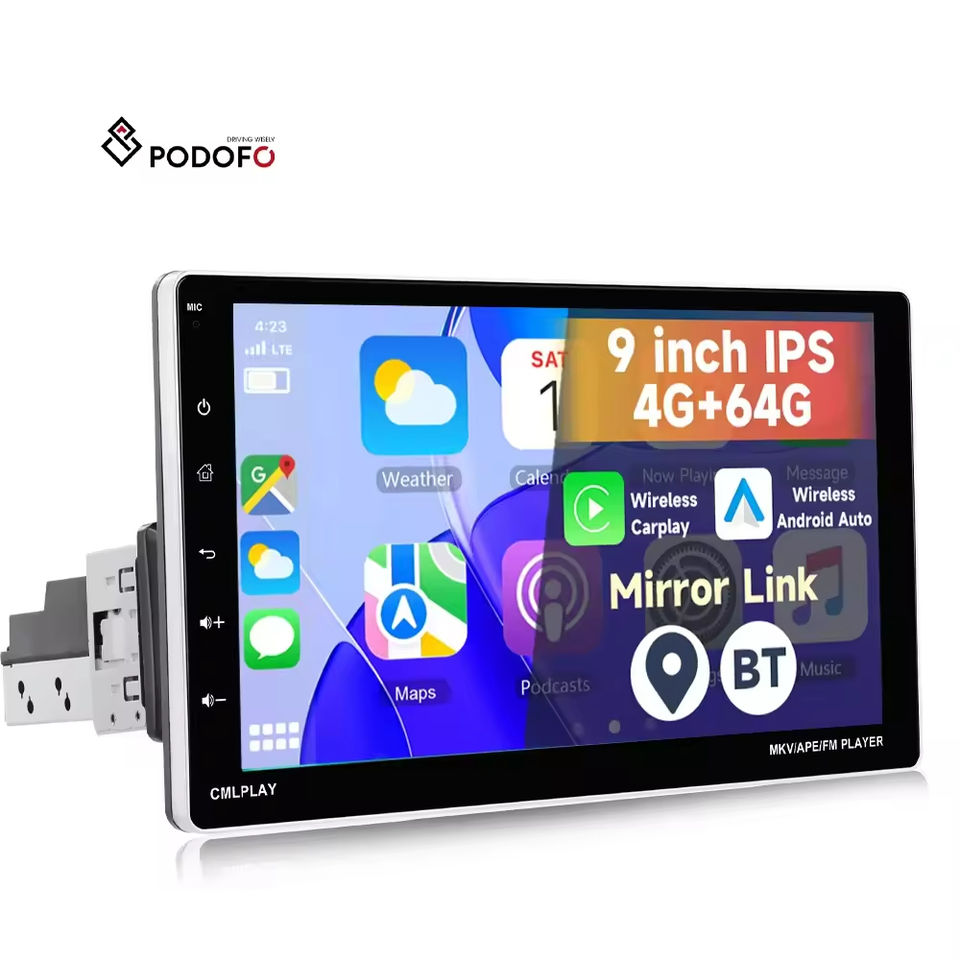 Autoradio Android Podofo 9 pouces 4+64 Go avec CarPlay et Android Auto, Bluetooth, Wi-Fi, radio, égaliseur DSP, GPS intégré, écran IPS réglable