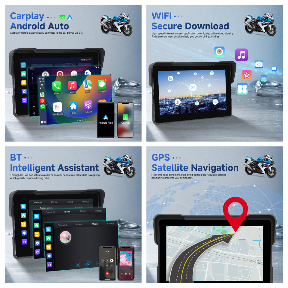 Podofo Android 2 + 32G Écran Carplay sans fil pour moto 7 ''Carplay sans fil/Android Auto GPS Wifi BT IP68 Autoradio étanche