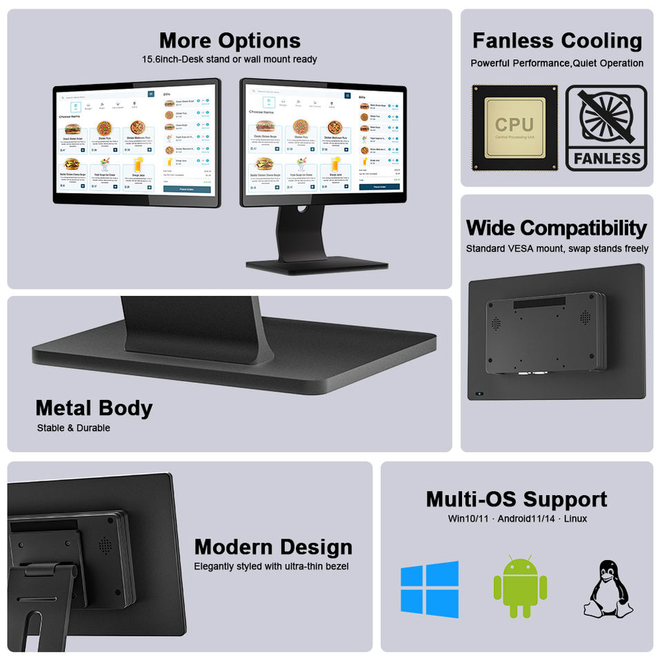 Système de point de vente (POS) tout-en-un avec écran tactile de 15,6 pouces, Windows 10/11, caisse enregistreuse, design fin avec support VESA