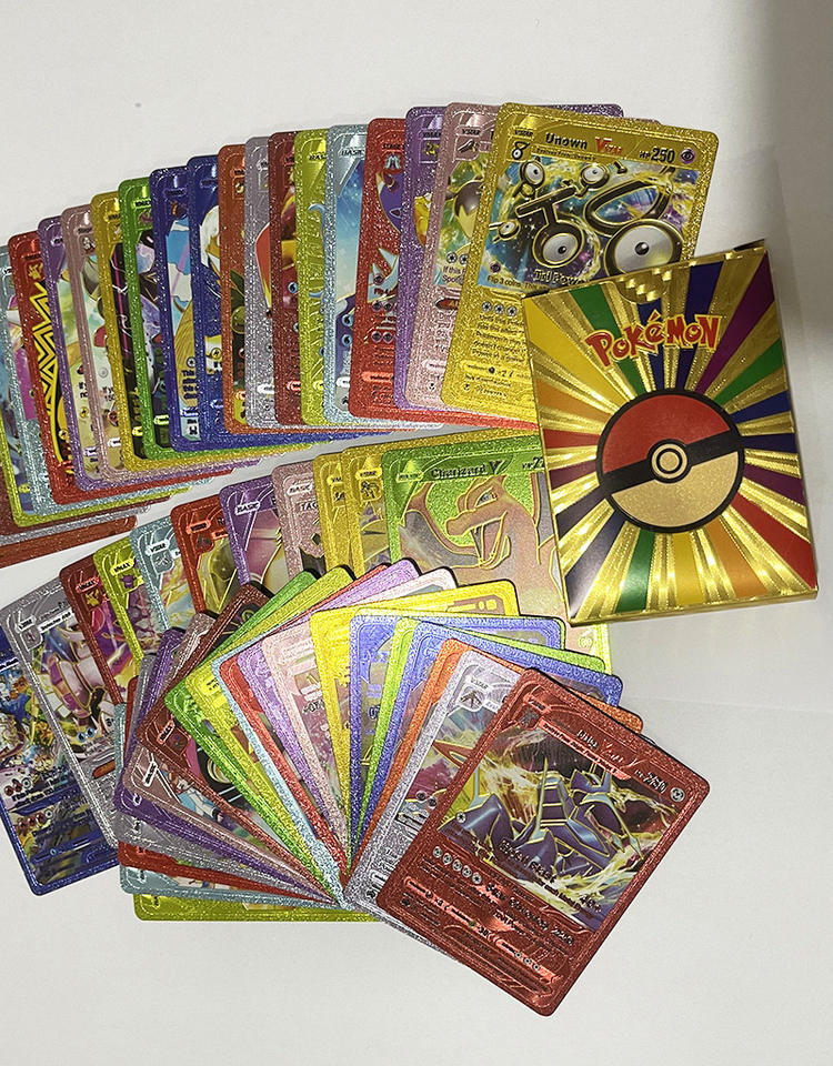 Cartes de jeu de société Pokémon en quatre langues, cartes en PVC avec feuille d'or, feuille d'argent, feuille noire, collection de cartes de combat colorées